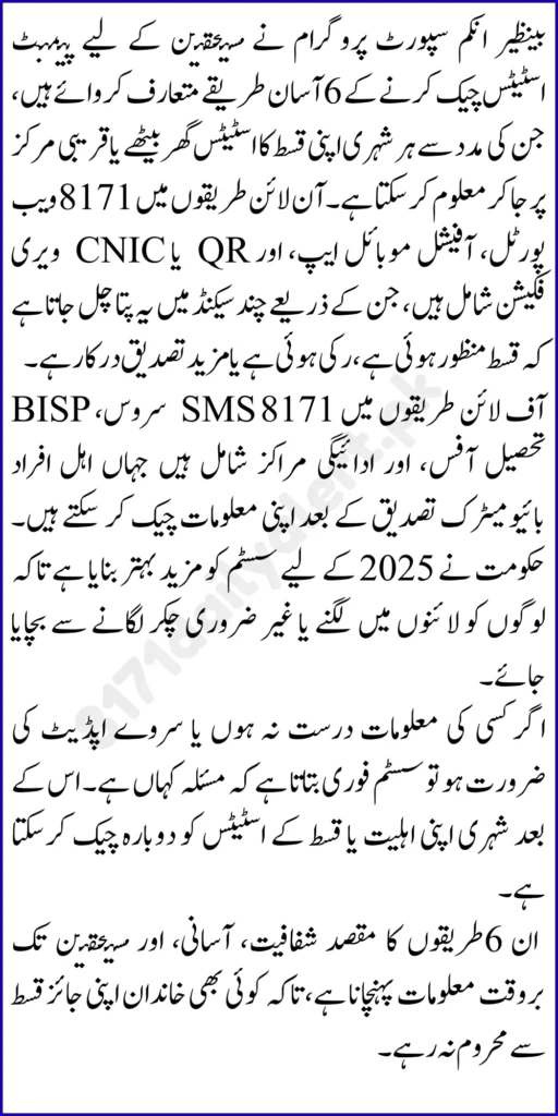6 Easy Ways to Check BISP 8171 Payment Status Online and Offline. If you receive financial support through BISP, checking your payment status on time is one of the smartest habits you can build. In 2025, the BISP 8171 system continues to run with stronger verification and frequent updates, which means your status can change from eligible to under verification, or from pending to payment ready. Many beneficiaries still waste time in lines because they do not check their status first. The good news is that you can confirm your BISP 8171 payment status using simple online and offline methods, often within a few minutes.