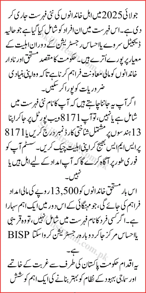 Also Read About : BISP 8171 Portal Update July 2025: How to Register, Check CNIC & Receive Rs 13,500 Payment