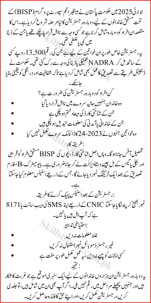 The Rs. 13,500 BISP payment is a lifeline for many struggling families in Pakistan, especially in inflation-hit and underserved areas. The July 2025 re-registration update provides a second chance for those left out due to errors, expired data, or changing life circumstances.