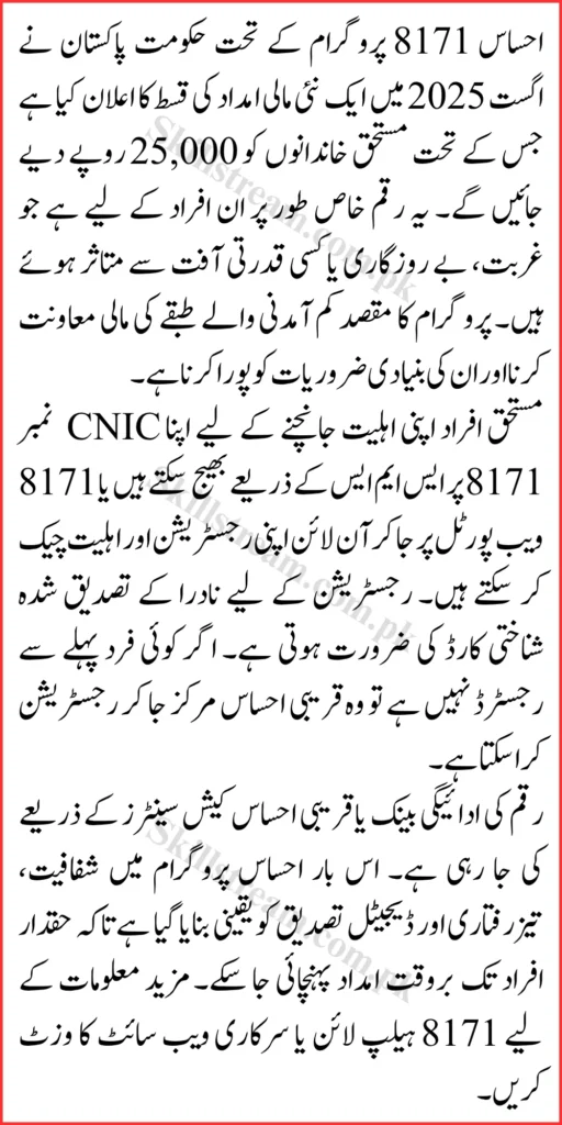 As of August 2025, the Ehsaas 8171 Program remains a key pillar of Pakistan’s social protection framework, providing direct financial assistance to the country’s most vulnerable families. The cash assistance of Rs. 25,000 has proven especially vital for households struggling with inflation, unemployment or natural disasters.
