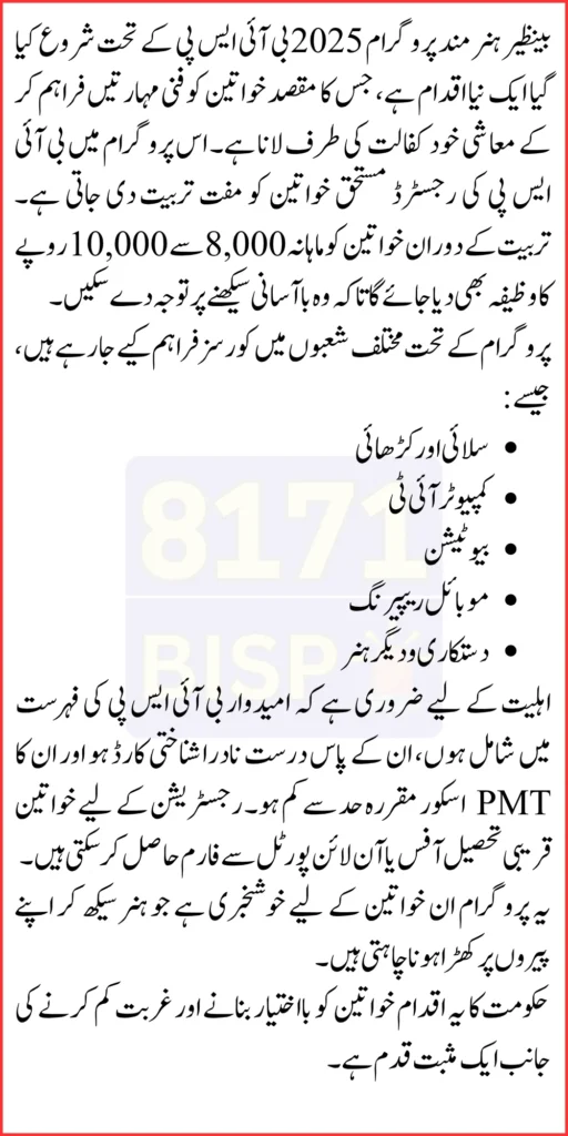 In 2025, the Government of Pakistan has launched an enhanced version of the Benazir Hunarmand Program, a key initiative under the broader Benazir Income Support Programme (BISP). This program offers free technical and vocational training along with a monthly stipend to eligible BISP beneficiaries, particularly women and youth, to help them become self-reliant and financially stable.