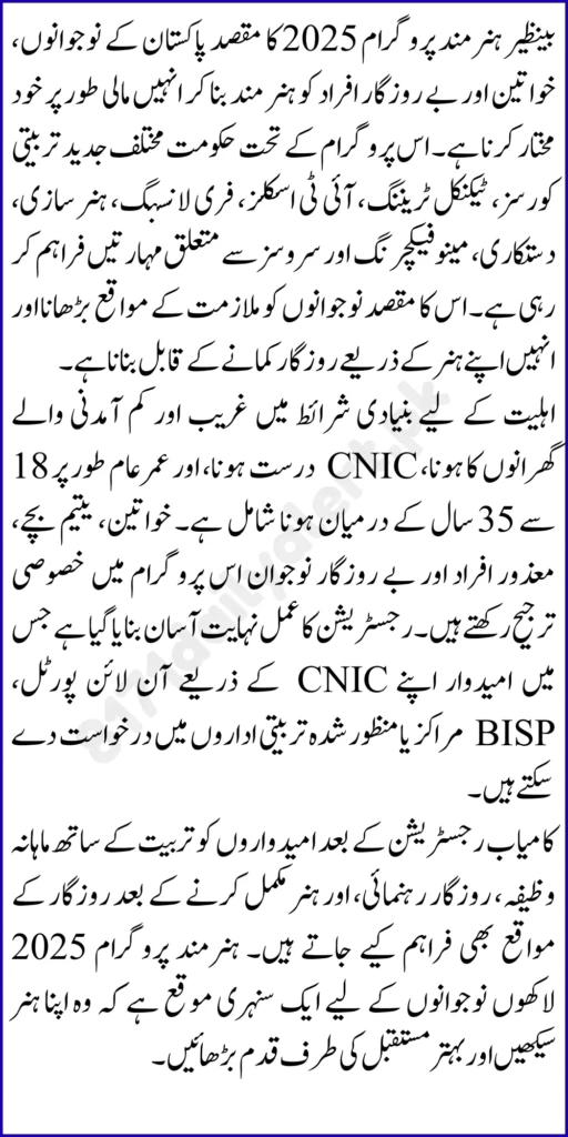 The Benazir Hunarmand Program supports a powerful idea in 2025: skills create independence. By offering vocational training, practical learning, and structured registration, this initiative helps underprivileged people build income pathways that last longer than temporary relief. If you want to benefit, focus on correct information, complete verification, choose a course with demand, and stay consistent in training. When skills become your strength, financial stability becomes more realistic for you and your family.