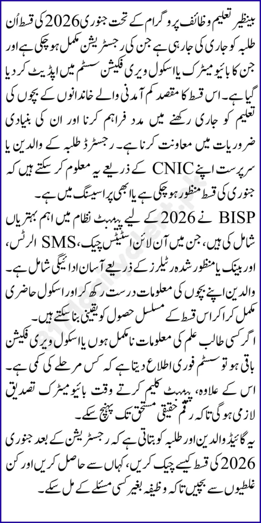 Families want an easy way to confirm whether the January stipend is active. In most cases, you track through the guardian’s CNIC status and related updates. The important goal is to confirm that your registration is processed and verification is complete.