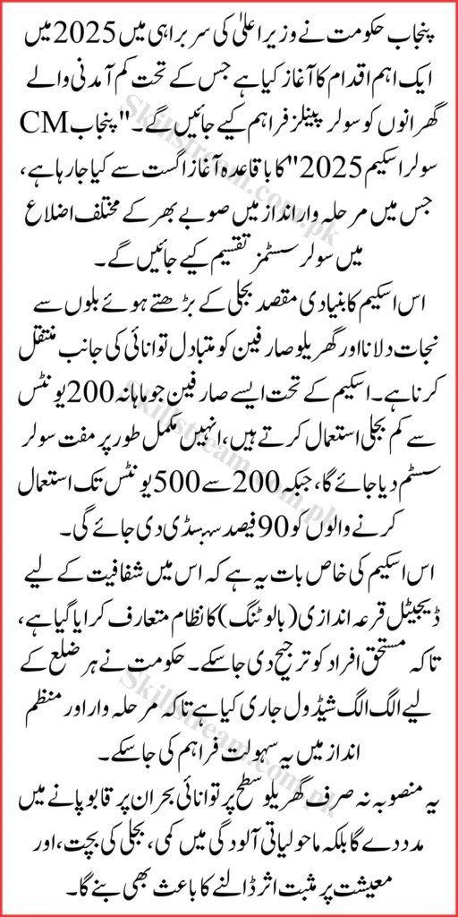 As of mid‑2025, the CM Punjab Free Solar Panel Scheme stands as one of the most ambitious renewable energy initiatives under Chief Minister Maryam Nawaz Sharif’s provincial government. This flagship programme aims to ease the burden of soaring electricity bills by distributing solar panel systems across Punjab, with free units for low-electricity consumers and heavily subsidized options for moderate users.
