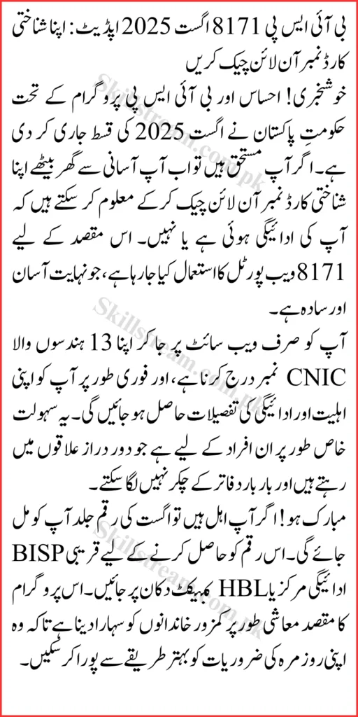 Also Read About : BISP 8171 Double Payment August 2025 – Latest Update, Eligibility & SMS Alert Guide