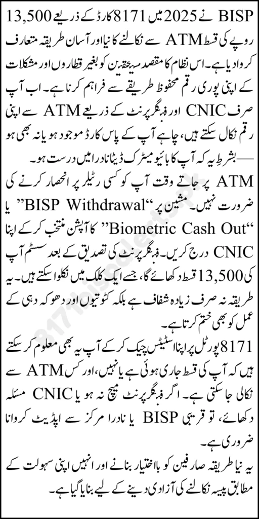 With digital payment systems expanding across Pakistan, many beneficiaries now want a clear and practical guide on BISP 8171 card 2025 ATM withdrawal for the 13,500 installment using CNIC and fingerprint verification. The goal is simple: receive your payment safely, quickly, and without unnecessary deductions. But to do that, you must understand how verification works, what you need before visiting an ATM, and how to fix common issues like fingerprint mismatch or CNIC status problems.