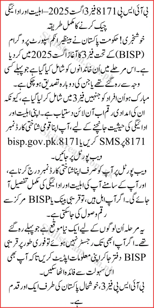 The BISP 8171 Phase 3 launch in August 2025 brings renewed hope to numerous underserved families. With expanded geographical inclusion, updated PMT criteria, and payment structures geared towards transparency, this phase ensures timely aid to deserving households. Verifying your eligibility is straightforward via SMS or the official portal and once confirmed, collection through biometric-enabled centers is efficient and secure.