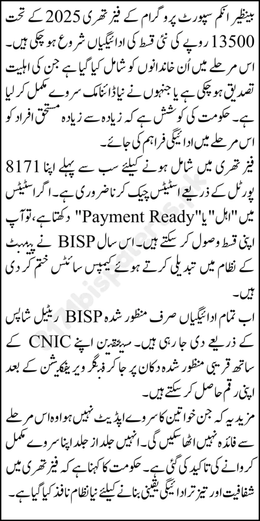 The BISP 8171 Phase 3 payment 2025 delivers the 13,500 installment to eligible households through a more structured and verification based process. If you are waiting for Phase 3, the most important step is to confirm your CNIC eligibility, ensure your verification status is clear, and follow the correct payment method to receive the full amount without delays or deductions.