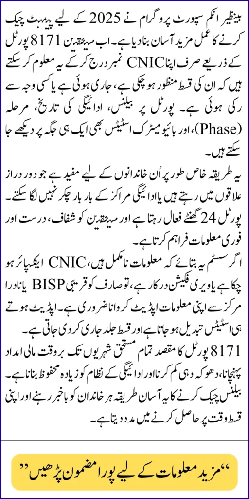 This guide explains how to check BISP balance online by CNIC, how the 8171 verification process works, how to understand common messages, and how to stay safe from fraud. Everything is written in clear steps so you can follow it even if you are checking for the first time.