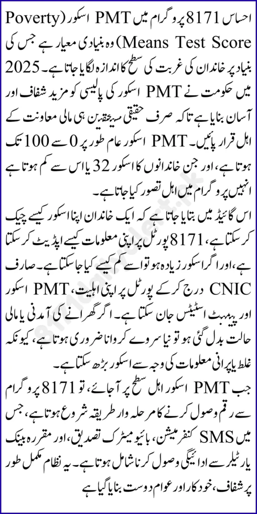 Ehsaas 8171 PMT Score Guide 2025: Start Receiving Money Step by Step. Many people in Pakistan ask one simple question in 2025: how do I start receiving money through Ehsaas using my PMT score via 8171? The confusion usually happens because families hear about PMT, eligibility, and surveys, but they do not know how these pieces connect. The reality is straightforward. The system checks your household information, assigns a PMT score, and then decides whether you qualify for financial assistance. After that, you use 8171 CNIC verification to confirm your status and track payments.