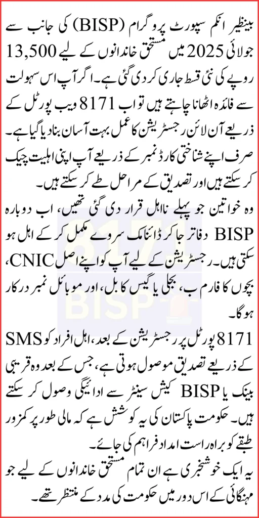 Also Read About : BISP 8171 Portal Update July 2025: How to Register, Check CNIC & Receive Rs 13,500 Payment