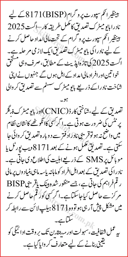 As part of the government’s commitment to ensuring transparency and reducing fraud in social welfare programs, biometric verification through NADRA has become a mandatory step for beneficiaries of the BISP 8171 program. In August 2025, this process is being reinforced more strictly, particularly for those who have faced delays or suspensions in receiving their Rs.13,500 quarterly payments.