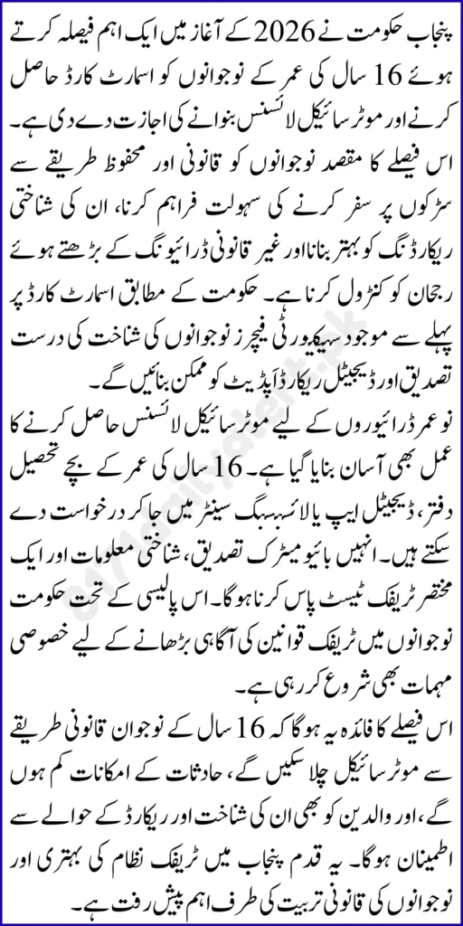 Punjab Lets 16 Year Olds Get Smart Cards and Motorcycle Licenses. Punjab now moves toward faster digital identity and safer legal riding by allowing 16 year olds to get smart cards and apply for motorcycle licenses through a more streamlined process. For students, young workers, and families, this update matters because it reduces paperwork stress, supports early identity verification, and encourages responsible riding with proper license validation. Instead of relying on informal shortcuts, teens can follow an official route that improves compliance and strengthens road safety culture.